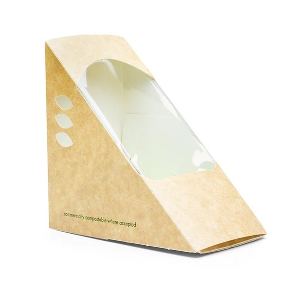 Medium 75mm eco-friendly sandwich wedge.|Perfect for cold grab n go sandwiches.|Kraft brown with eco messaging in green & our signature Green Leaf Band- Large clear window to showcase contents, small leaf-shaped accent windows on the side.|Made from sustainably sourced paper, with an eco water-based lining / coating