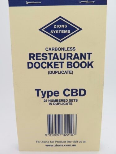 Zions carbonless restaurant and cafe docket book | Zions offers a wide range of single, duplicate, triplicate and quadruplicate restaurant docket books, suitable for all styles of bistros, cafes, restaurants and take-away outlets | Strong cardboard backing for ease of order taking | Consecutively numbered on all copies ; Recyclable | Recyclable | 25 sets per book | Top copy white, bottom copy yellow | Printed blue ink and consecutively numbered on both copies | 17 entries per docket