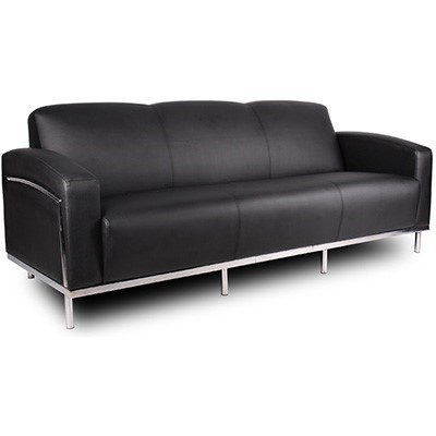 Make a lasting first impression with our stylish range of reception seating | The range of Sienna reception seating offers a cost effective solution to your reception requirements | All our reception seating is backed by a one year warranty | Three seater lounge with soft curve polyurethane black upholstery and chrome frame | Black PU Upholstery | Steel Chrome External Frame | 1 year warranty