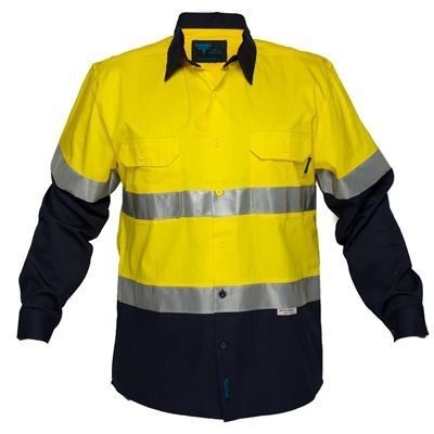 High visibility two tone lightweight long sleeve shirt with tape | 100% Cotton fabric for added comfort and breathability | 50+ UPF rated fabric to block 98% of UV rays | 2 pockets for secure storage | Underarm cool flow mesh panel for ventilation | Back vent with cool flow mesh | Contrast panels for protection against dirt