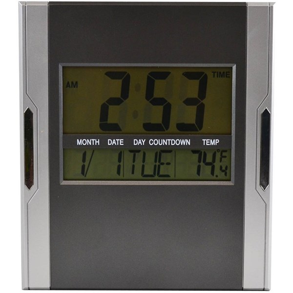 Wall Mountable and comes with built in stand to display on desk | Time, Day, Date and Month display | Alarm and Snooze function | Temperature display | Calendar Display | Requires 2 x AA battery