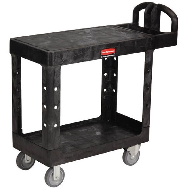 The Rubbermaid Commercial Heavy-Duty Utility Cart with flat shelf is a durable easy to manoeuvre all purpose cart Designed to transport oversized bulk items | Two swivel castors for easy manoeuvrability | Designed to transport bulky, oversized items or as a mobile work surface, the Rubbermaid Flat Shelf Cart is made of sturdy structural resin and has two fixed and two swivel non-marking castors | Ergonomically designed push handle provides optimum hand placement and push height improving control and worker safety | 227kg capacity, 113.5kg for each shelf | Includes tool caddy