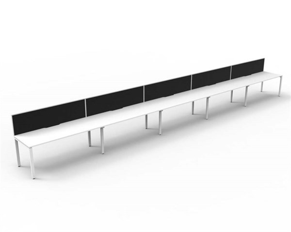 Maximise floor space and leg room with the stylish Rapid Infinity bench system, now available in the Deluxe range with 750(d)mm worktops and new coloured tops and frames | Available in a variety of configurations as straight benches or corner workstations in rows or pods to suit your office space | Deluxe Rapid Infinity 5 Person Single Sided Workstation - With Screen | Dual Cross Bar For Added Stability | E1 Enviroboard Melamine Worksurface | Adjustable Levelling Feet