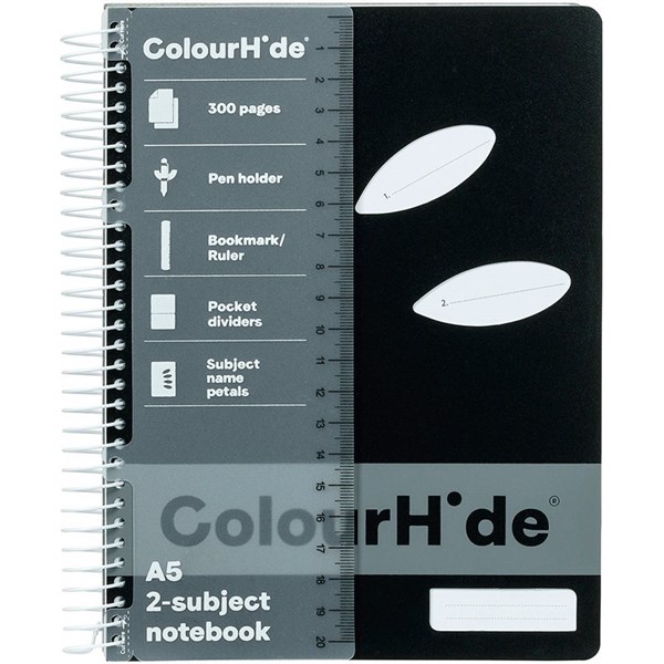ColourHide 2 subject A5 notebook is big enough for most things and small enough to be really handy too | Thick and easy to rip out pages, that are divided into 2 subjects | Pen Holder | Subject name cut-outs | Perforated Pages | Reusable ruler