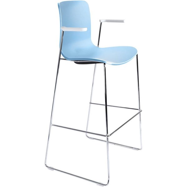 DAL ACTI BAR STOOL SLED BASE HIGH 760MM ARMS WHITE ARM-PADS AND CHROME FRAME PALE BLUE POLYPROP SHELL