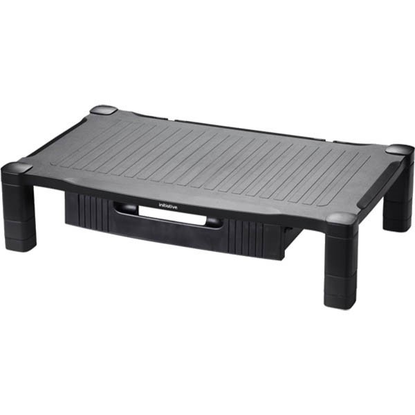 The Initiative monitor stand features built in cable management and rubber feet to protect your work surface and a convenient pull out drawer for storage | The extra wide design is suitable for use with most monitors and allows your keyboard to slide underneath for convenient, space saving storage | Raises your laptop or monitor to a comfortable viewing height | Built in cable management | Rubber feet help protect work surfaces | Designed to enable a keyboard to be slide underneath | Made in China