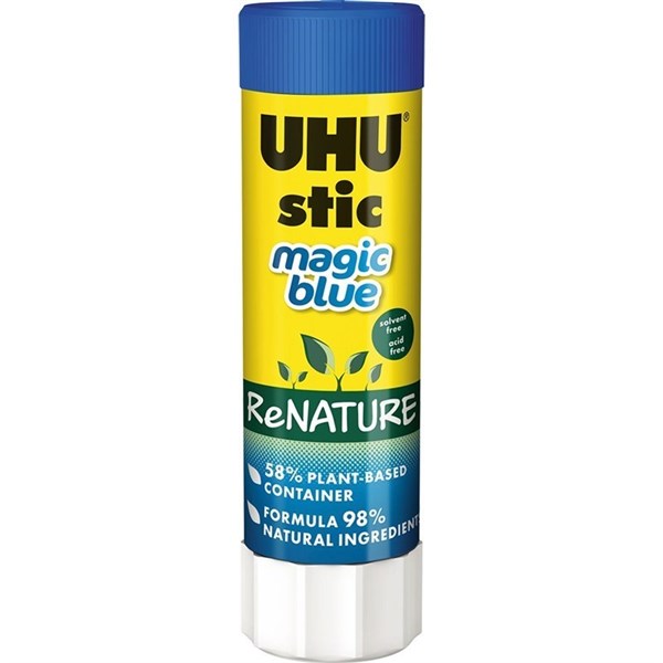 Eco-Friendly UHU Re-Nature Magic Blue Glue Stick - Goes on Blue, Dries Clear | Australia's most natural Glue Stick | With a container made from 58% plant based materials that's 100% recyclable, and glue made from 98% natural ingredients including water | This glue has reduced CO2 emissions and lessens fossil fuel use | Featuring the same strong, fast-drying and safe formula used in all UHU Glue Sticks | | Applies blue and magically dries clear | Container from 58% plant-based raw materials | Reduced CO2-emissions (reduced carbon footprint) | Lower consumption of fossil raw materials | Unique screw cap that prevents glue from drying out | Glue formula with 98% natural ingredients (including water) | Without solvents | Glues fast, strong and durable | Cold washable