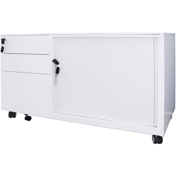 The Rapidline Mobile Caddy allows personal storage at the Workstation- Ideal for users with a permanent workstation or Hot Desk users | The unit is fully lockable and has a Flush Front mobile pedestal and a Tambour door section with a centre shelf | Comes in left or right hand options | Foolscap Size Files Run East To West In File Drawer | A4 Size Files Run North To South | In File Drawer | Heavy Duty Hard Floor Castors | Ball Bearing Runners | Anti-Tilt | Backed By a 10-year warranty | Due to freight costs, some orders may incur a delivery charge and this will vary depending on the order, particularly in regional areas