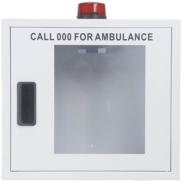 Keep your AED safely stored and easy to access with this wall-mounted AED cabinet | Cabinet comes with alarm and strobe light that activates when the door in opened to alert everyone in the area that the AED has been deployed for a rescue | Easy to install comes with pre-drilled mounting holes and screws | 9V battery provides power for the audible alarm and strobe light | AED cabinet designed to protect AED | Alarm and strobe light activate when the door is opened | AED sits inside the cabinet with a transparent door for better visibility | Compatible with most AED models | Easy to install comes with pre-drilled mounting holes and screws