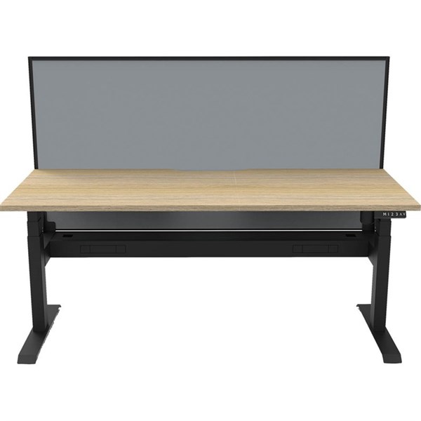 Rapidline Boost Light SIngle Workstation | Boost Light has a visible single motor underframe in powdercoat | Leg column size: 90x60mm, desk mounting top plate size: 500mm | Digital control panel with 3 pre-set positions, LED display panel, keypad safety lock & reminder alarm setting | Anti-collision technology, noise emission of less than 50DB | Lifting capacity of 80kg with a max speed of 25mm per second | 700mm wide foot size with adjustable leveling feet | Overall height of 1330mm when fitted with screens | E0 rated tops available in Natural White or Natural Oak | Desks available in 1200mm, 1500mm & 1800mm with a scalloped edge for cable access | Available add-ons: Cable tray for cable tidy or pinnable privacy screen | 10 year warranty