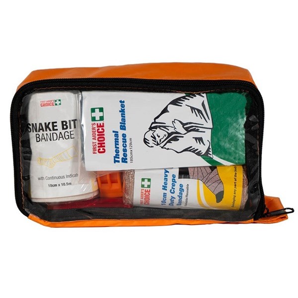 The First aiders choice outdoor and remote module is a valuable addition to a first aid kit when you are venturing into remote work locations or engaging in outdoor activities | This module typically includes essential items to address common injuries and emergencies that can occur in the great outdoors such as snake bites, insect stings and broken bones | This module includes a rescue whistle and torch to draw attention in emergency situations | Contents are packed into a module case that is colour coded and labelled making it an easy grab and go option in an emergency | The clear front on the case allows users to see the contents of the module without having to open it | This transparency ensures that items are easily identifiable, saving time in an emergency | The velcro strap at the back of the module case is a versatile attachment method- Users can secure the case to first aid kits, backpacks, or even their pants so its always within reach