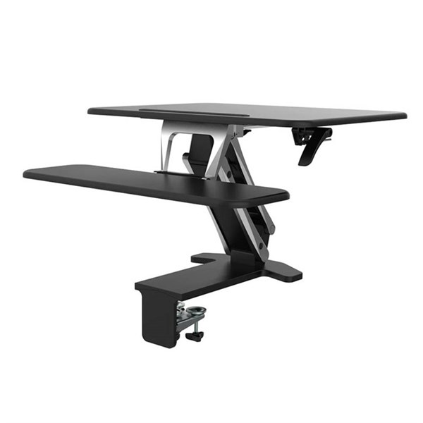 The Sylex arise compulator is ideal for sit or stand solution for people who are doing mixed computer and written tasks | It is much more compact than a full width desktop unit and leaves desk top space for reference materials, telephone, chargers, documents and the all important coffee cup | The clamp on version gives a secure fixed point which is dedicated to computer based work | When not in use, the keyboard tray can be folded up out of the way | A very handy feature which makes the compulator even more compact when not in use | This is the ideal unit for reception desks where a hutch or overhang prevents using a full sized device | We expect it will be popular too on small work benches in medical suites, at nurses stations, in cafes or indeed anywhere where sit/stand working is valued but space is limited | The clamp on unit simply attaches to the front edge of any surface and provides a one handle easy adjustable sit stand work surface | The clamp is easily adjusted to suit the thickness of the tops which creates a very stable and secure mounting ready for immediate use | Central gas assisted height adjustment | Easy height adjustment via one activation paddle | Fold up keyboard surface | Two keyboard positions, flat or negative tilt | Support groove on the surface to mount smart phones and tablets