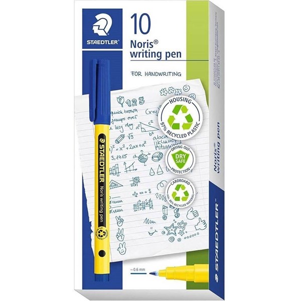 The Staedtler noris writing pen is ideal for both beginners and seasoned writers | It has robust plastic tip that resists pressure and offers a smooth glide over paper, ensuring consistent, neat handwriting | Housing is made of 97percent recycled plastic | It features a water-based ink that is dry-safe and the pen can be left uncapped for days without drying up | The ink washes out easily from most textiles