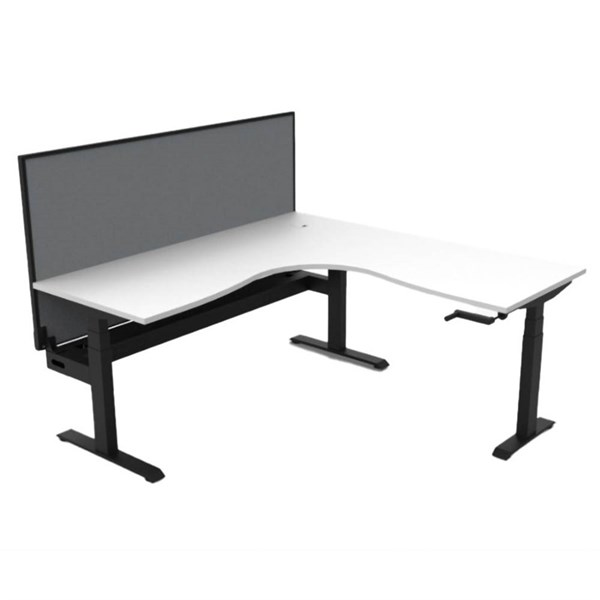 The Rapidline workstation is the newest and most affordable addition to the Boost+ range | The Boost Crank presents a manual height-adjustable workstation solution available in single sided, back to back and corner configurations | The manual crank mechanism allows for easy height adjustment, while the durable table top and sturdy underframe provide a stable and efficient workspace | Underframe finish in black satin or white satin powder coat | With fully ducted cable tray with punchout for power and data to be fitted to either external or internal of frame