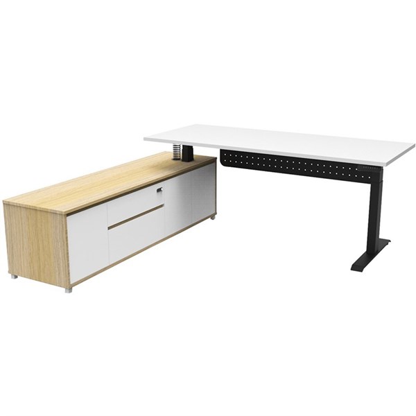 The Boost Plus Executive Desk is the flagship of corporate comfort | Its height-adjustable design utilises dual motors for smooth and effortless adjustments, offering three pre-set positions for personalised comfort | Equipped with anti-collision and anti-tilt technology, this desk ensures safe operation | The integrated side cabinet provides convenient storage with drawers and cupboards, enhancing workspace organisation and efficiency | Left Hand Configuration