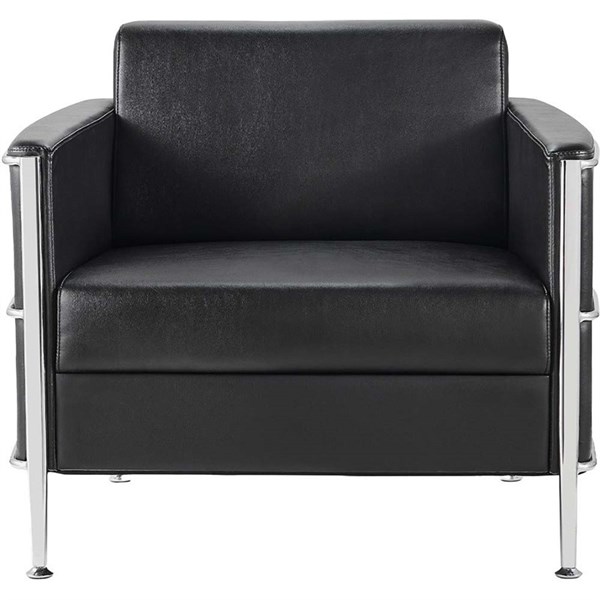 The Eclipse Lounge Range offers a contemporary seating solution with a chrome wrap-around frame and black PU leather upholstery | Designed for comfort and durability, it features adjustable feet for leveling on uneven surfaces and is tested to meet rigorous safety standards | Backed by a 3-year warranty for peace of mind