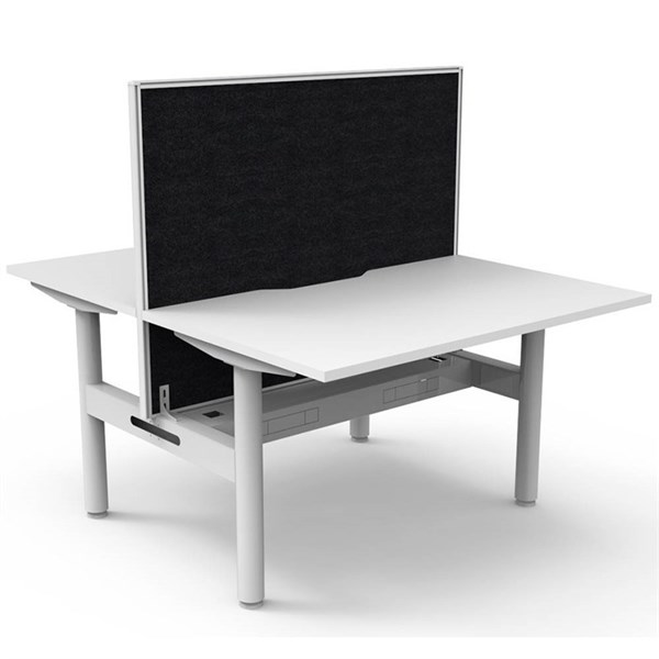 The Halo Static Back To Back Workstation provides a collaborative workspace for two users | It features a generous work surface with a scallop cut-out to the rear and a robust powder-coated frame | Adjustable leveling feet ensure stability on uneven floors | This workstation is designed for efficient and comfortable work, and can be customised with optional accessories like cable management solutions and privacy screens