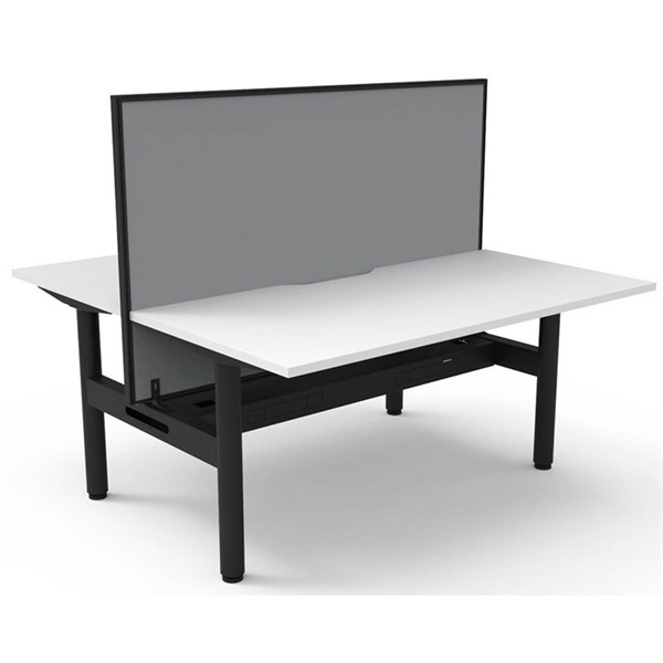 The Halo Static Back To Back Workstation provides a collaborative workspace for two users | It features a generous work surface with a scallop cut-out to the rear and a robust powder-coated frame | Adjustable leveling feet ensure stability on uneven floors | This workstation is designed for efficient and comfortable work, and can be customised with optional accessories like cable management solutions and privacy screens