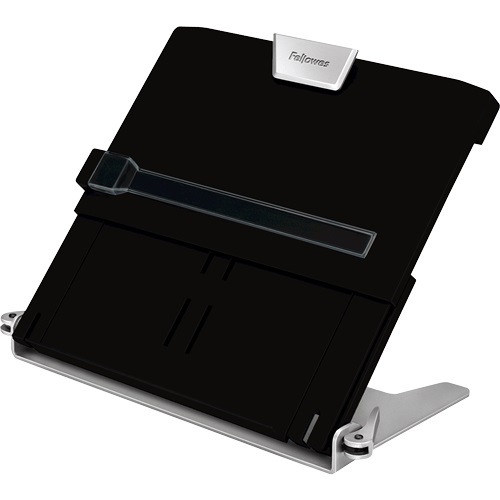 Fellowes Professional Series In-line Copyholder | Places documents between monitor and keyboard for optimal viewing range | Supports books, catalogues, and landscape sheets | Locks at any angle from 90 to 0 degrees | Moveable, magnetic line guide holds documents in place | Stable weighted base; unit folds flat for easy storage | Holds letter, legal, and A4 size documents | Holds up to 250 sheets