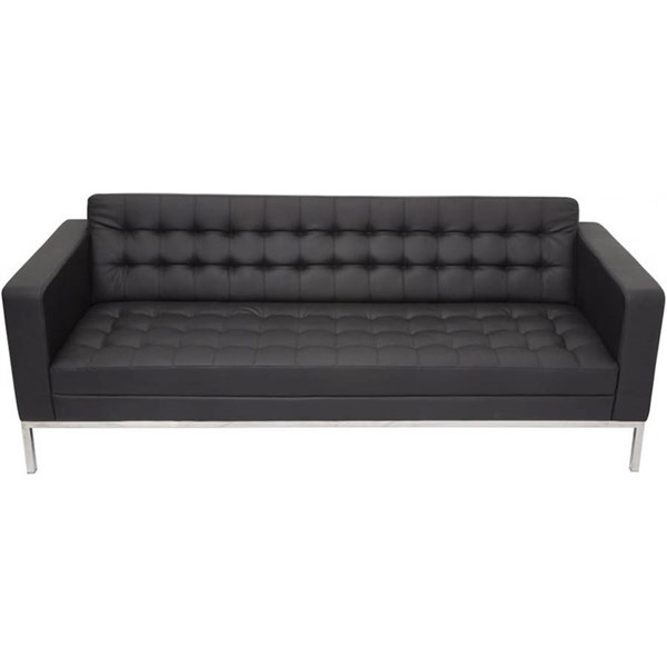 Rapidline Venus lounge with distinctive button finish ideal for reception or meeting areas | Elegant reception area three seat arm chair with button finish to black PU, easy clean upholstery | Stainless steel underframe and legs | Backed by a 3 year warranty | Button finish | SGS: EN12520 Certification | Due to freight costs, some orders may incur a delivery charge and this will vary depending on the order, particularly in regional areas- Delivery costs can be confirmed at the time of order