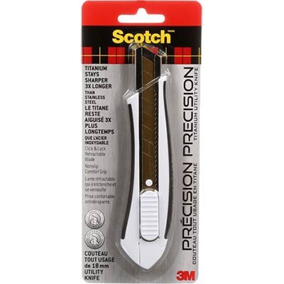 Scotch Titanium Utility Knife | Ideal for home, office, or DIY projects- These superior titanium coated blades are great for cutting thick materials including cardboard, foam board, plastic, rope and more | Features an angled blade for precision cutting performance | A new sharp edge is just a snap - use the quick change cap to always have a sharp edge ready | Each blade has 8 snap-off points | Stays sharper 3 x longer than stainless steel | The perfect click and lock retractable blade and a non-slip comfort grip