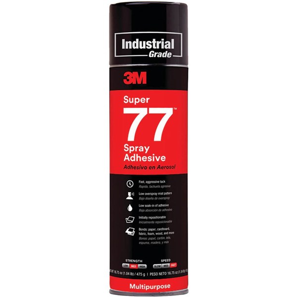 3M Super 77 Multipurpose Spray Adhesive is an extremely versatile, fast-drying, and transparent spray adhesive that bonds a wide range of lightweight materials | Fast, permanent bond provides fast results to keep projects moving ahead | The spray formula is easy to dispense and apply directly onto surfaces and materials where you need | Its aggressive tack gives you a high initial grab and sufficient open time to position materials properly | High-solids content supports its low soak-in property, giving you time to position parts for best fit | This attribute also provides higher coverage than competing spray adhesives and helps create soft, non-dimpling glue lines | The combination of fast tack, strong bond, and clean appearance make it ideal for projects all throughout your home or business | Forms strong bonds a wide array of materials including paper, cardboard, fabric and cushion foam to plastic, metal, wood and much more | 3M Super 77 Multipurpose Adhesive is CARB compliant and eligible for LEED credits | Uses for 3M Super 77 Multipurpose Adhesive include: Home improvement and repair projects Attaching fiberglass insulation and drywall corner beads Bonding thin films, foils and fabrics Scrapbooking, picture framing and mounting presentations (photo safe) General decorating and crafts, including wreaths, silk flower arrangements, models and many other projects Ideal for home, office, crafts, and hobbies | Finger-touch, targeted control ensures minimal overspray, waste, and clean-up | Great spray pattern and low soak-in for high coverage and strong, long-lasting bond | High initial grab and aggressive tack helps keep fast-paced projects moving forward | Bonds quickly in 15 seconds for fast, permanent results and high productivity | Lower viscosity formula than competing brands stays in place with little to no run or migration | Repositionable while providing long-lasting strength | Ideal on most lightweight materials including foam core board, paper, cardboard, fabric, felt, cork and wood | Also bonds metals and plastics including ABS, acrylics, PVC and HP nylons | Fast, Aggressive Tack | Low Overspray Mist Pattern | Low Soak-In of Adhesive | Initially Repositionable | Clear | Quality Performance | Acid Free | Medium Strength | Fast Speed