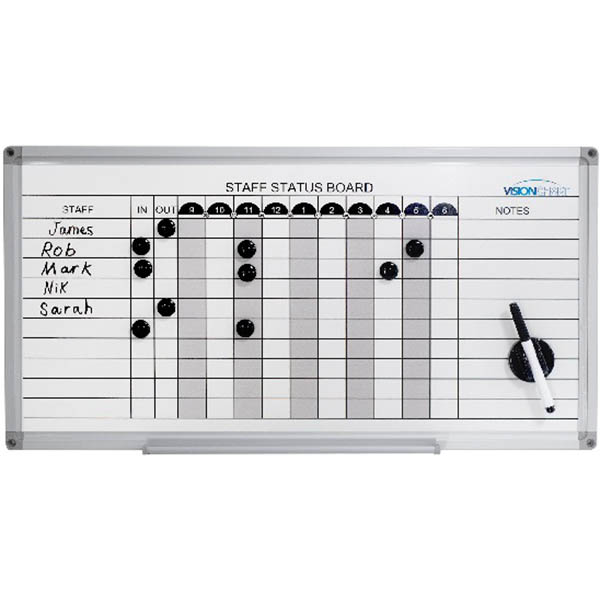 Staff Status Planner | Ideal for every busy workplace or staff roster system | Supplied with Magnetic marker buttons, Black adhesive letters/numbers, Bonus black marker, White magnetic name blocks | In and Out staff status | Due to freight costs, some orders may incur a delivery charge and this will vary depending on the order, particularly in regional areas- Delivery costs can be confirmed at the time of order