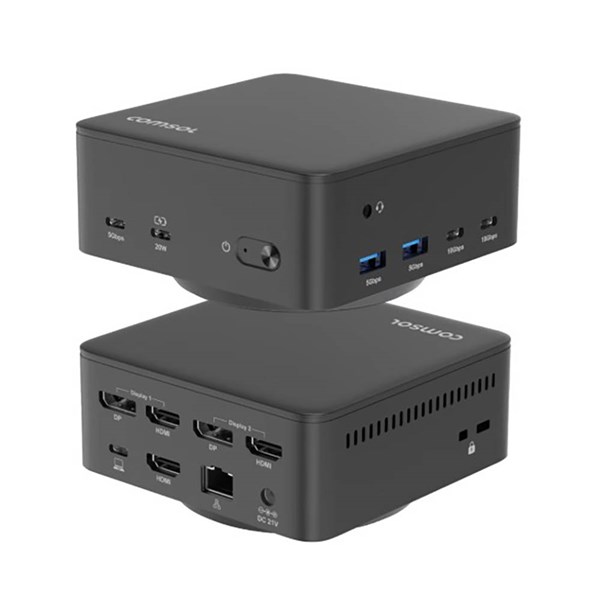 The Comsol Universal Triple 4K Docking Station Black DS34HDVS is designed to expand connectivity for USB-C enabled laptops, tablets, and PCs by connecting multiple peripherals and displays through a single cable | It supports triple 4K monitor output, allowing users to run up to three displays simultaneously for enhanced productivity and multitasking | Equipped with multiple USB-A and USB-C ports, HDMI and DisplayPort outputs, Gigabit Ethernet, and audio connectivity, it provides a complete workstation solution | The included power adapter delivers up to 98W Power Delivery to charge your laptop while powering connected devices, and the compact design with VESA mount support helps keep your workspace organised